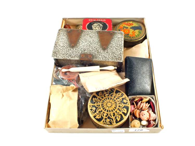 Various needle tins containing buttons etc and an Ivory umbrella needle holder