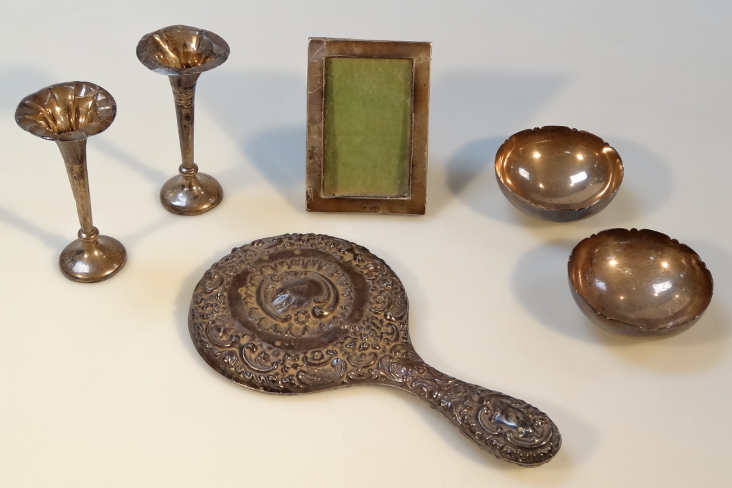 to include a photograph frame with rectangular outline, Chester, date mark rubbed, 12cm high, two dishes, specimen vases, etc. (a quantity)