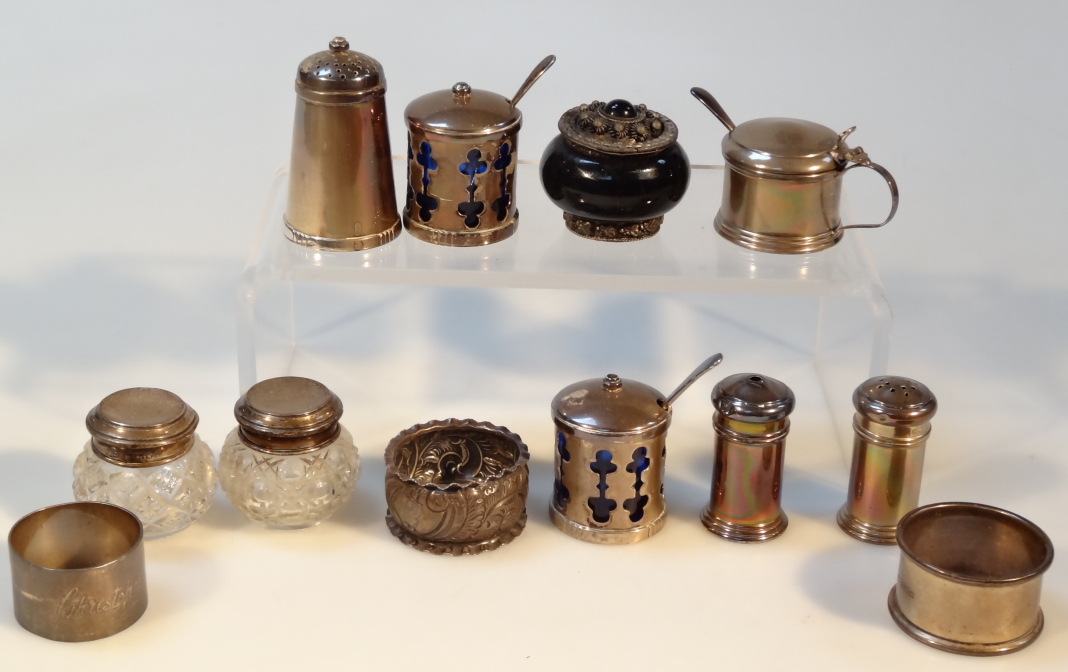 mustard pot, pepper pot, 6.5cm high, napkin rings, white metal inkwell, etc. (a quantity, various dates and makers)