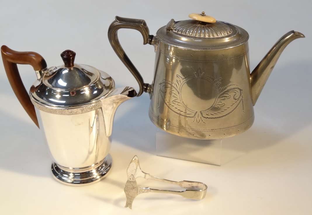 etc comprising a pair of bows with textured fish ends, 11cm high, a Viners plated coffee pot and a plated teapot. (3)