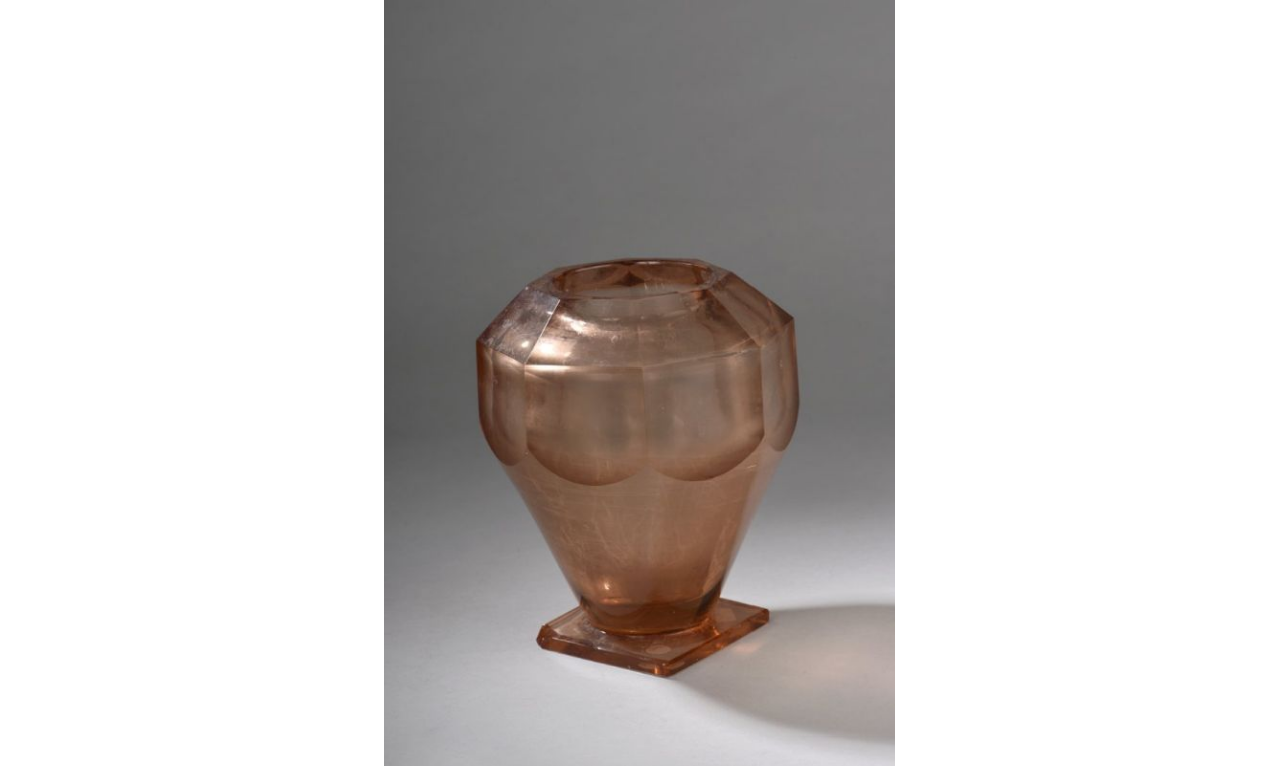 Vase cylindrique à base moulurée en verre multicouches rose et vert à pailletons cuivre, gravé à l'acide de carrés posés sur la pointe et frise de chevrons (éclat à l'angle de la base)