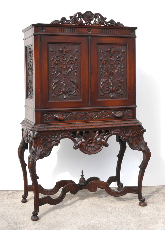 Carved crest with shell and foliate scroll, 2 doors with foliate and garland panels over single full length drawer. Base with pierced carved and shaped skirt, legs and stretcher