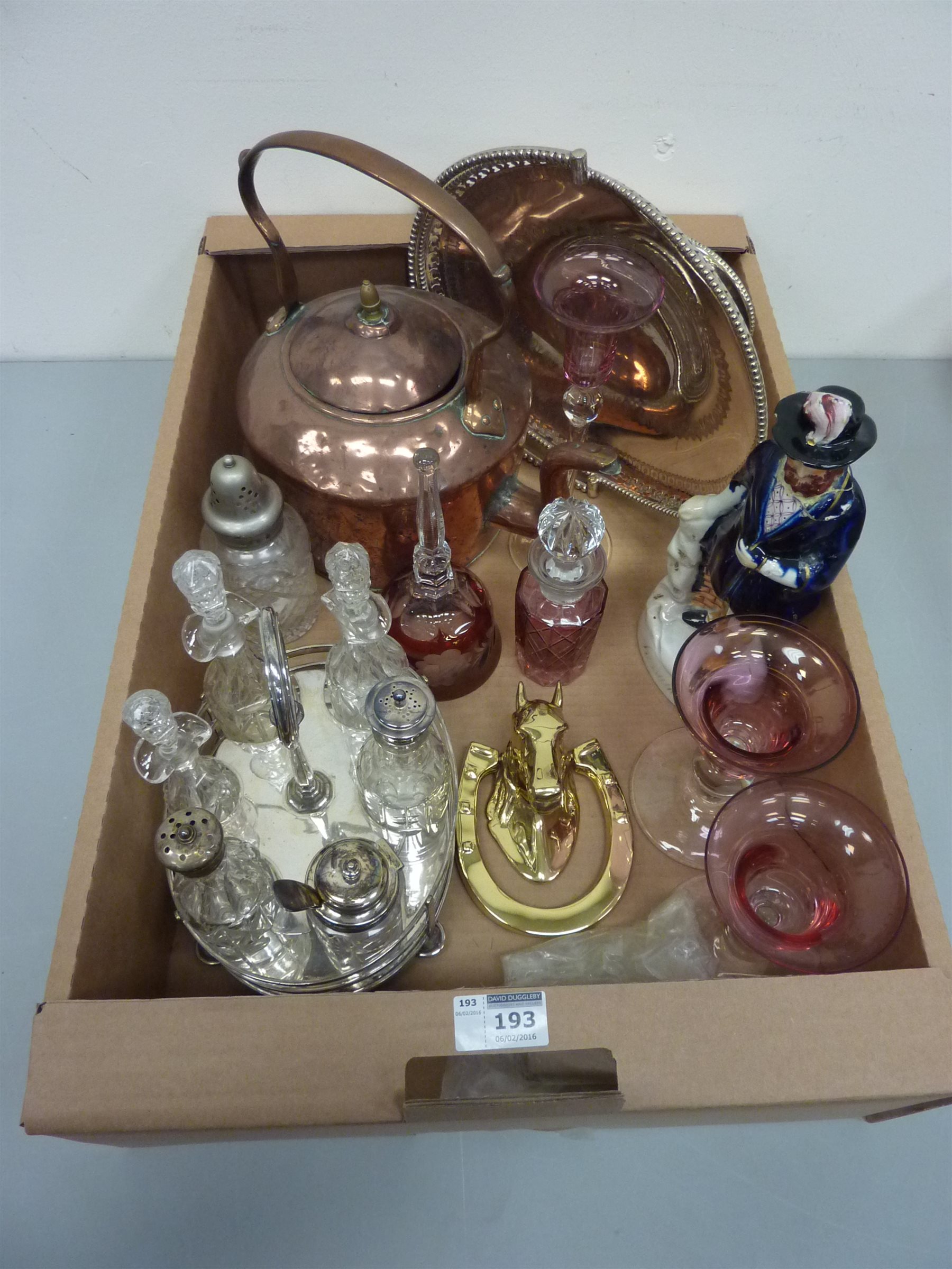 Victorian copper kettle, Staffordshire figure (a/f), cranberry glass, silver-plated basket with swing handle, cruet set and a brass door knocker in the form of a horse's head and horseshoe in one box