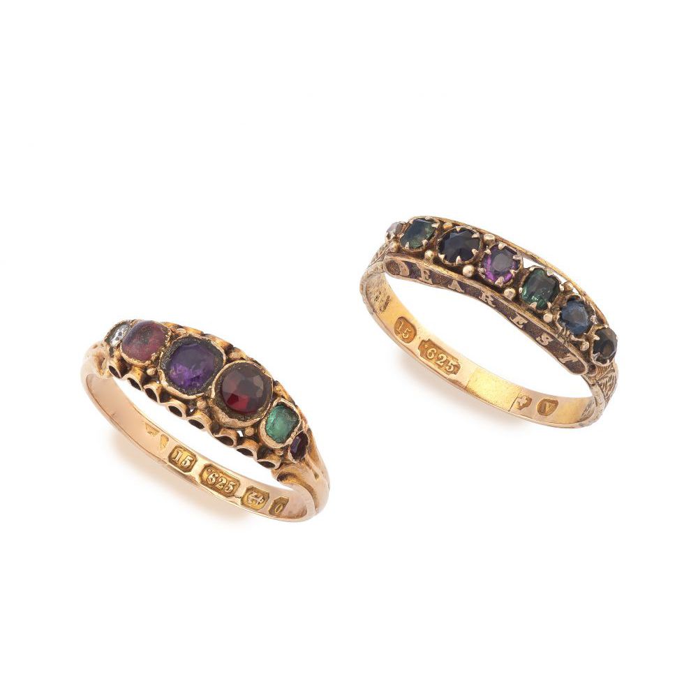 claw-set with a diamond, emerald, ruby and sapphire, the sides heightened by the letters DEAREST, to an engraved shank, two stones replaced, size P; and a Victorian 'Regard' 15ct gold ring, Birmingham 1888, collet-set with a ruby, emerald, garnet, am