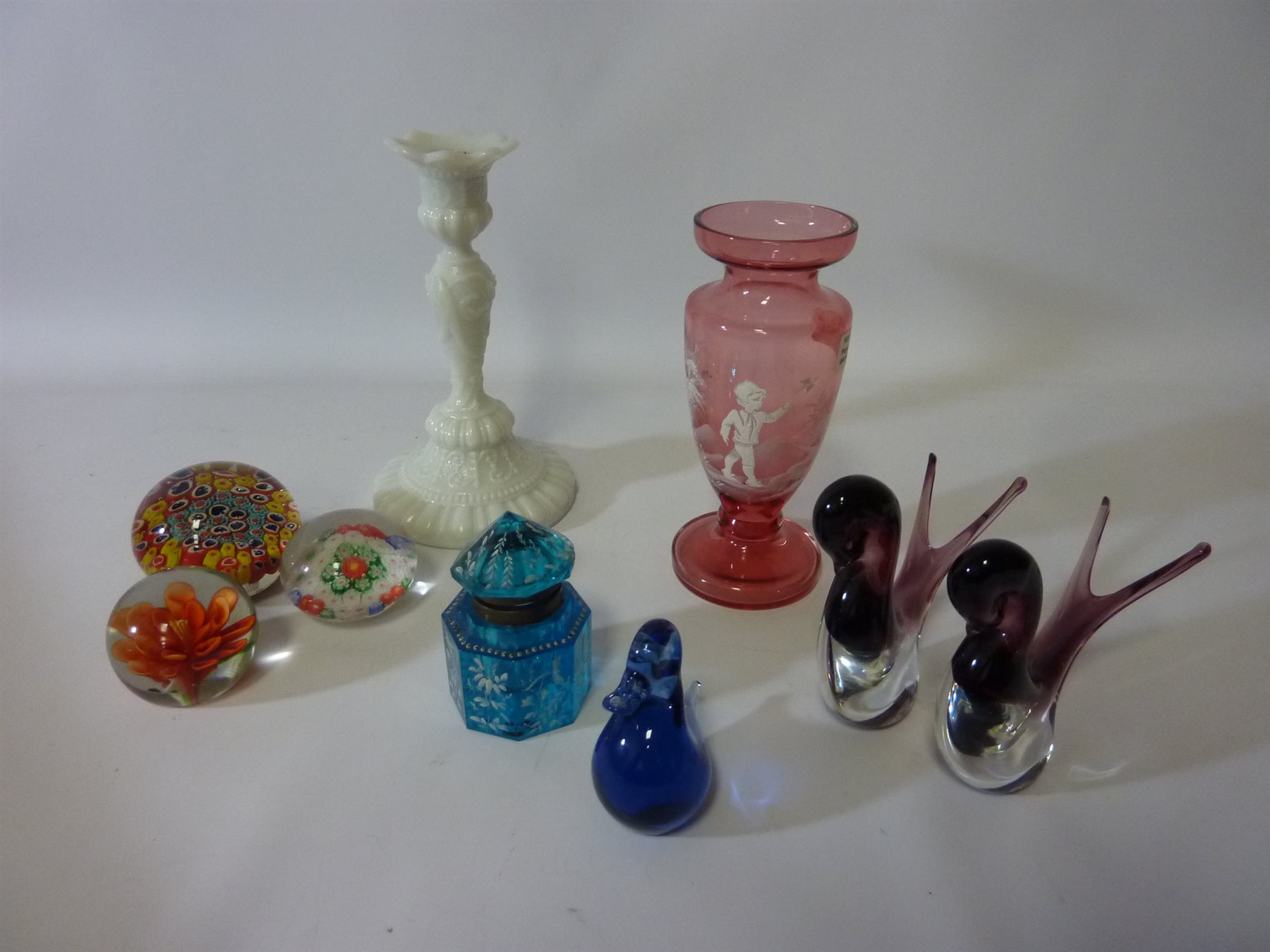 Victorian/early 20th century blue glass hand painted inkwell, Mary Gregory type cranberry glass vase
