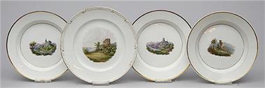 Im Spiegel bunt gemalte Ansichten von Schlössern und Burgen, dabei "Rheineck" (so rückseitig in Schwarz bez.), Goldränder (1x reliefiert) teils l. berieben. Szeptermarke mit rotem bzw. violettem Reichsapfel über KPM, Berlin, 19. Jh. 1. Wahl. D. 17,5
