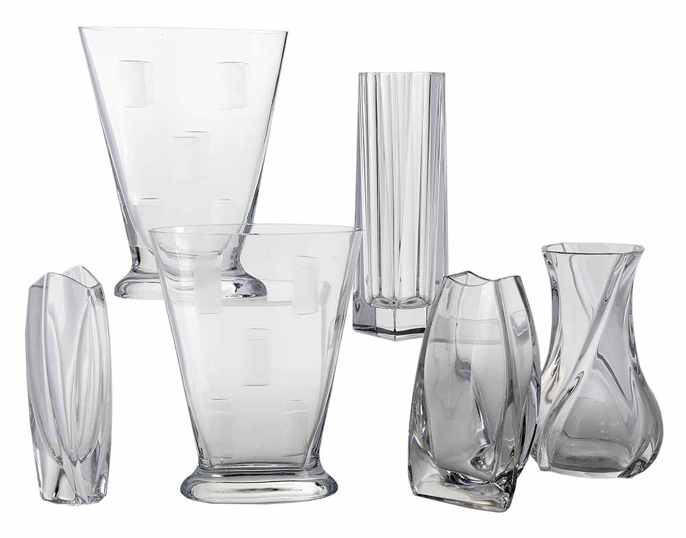 Vases French, 20th century: large vase with swirl decoration, Baccarat circular mark, 10-1/4 in.; Giverney vase with Baccarat mark, 9-7/8 in.; flaring vase with Baccarat mark, 9-1/2 in.; pair unmarked frosted-to-clear footed vases, 11-3/4 in.; unmark
