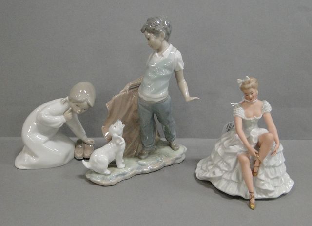 Wallendorf figurin H17cm, Lladro figurin H13cm samt Nao figurin pojke med hund H25cm