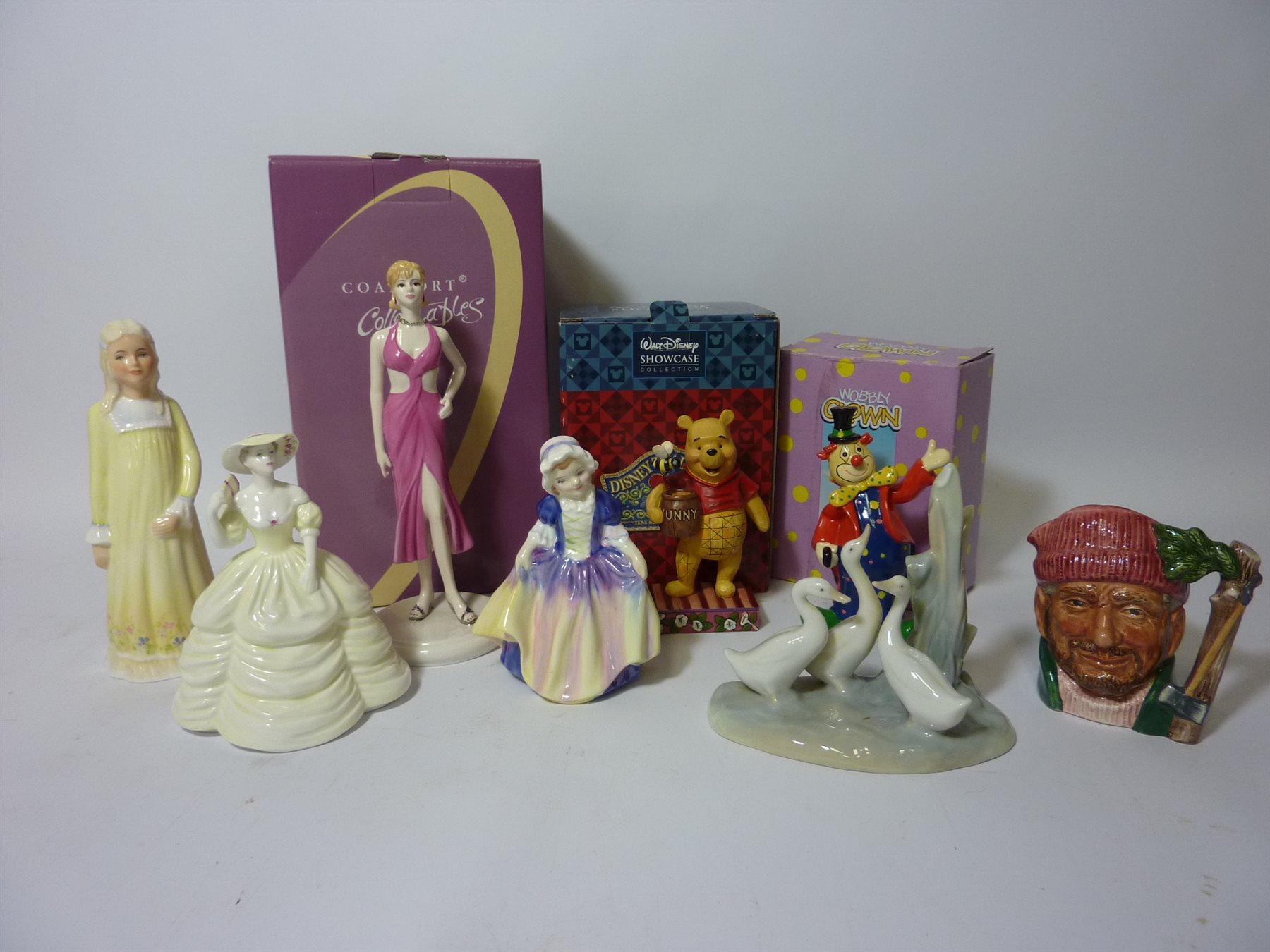 Royal Doulton figure 'Dinky Do' HN1678, character jug, Coalport figure 'Catriona', Howard J. Wedgwood figure 'Cherie', Nao goose group and other items in one box