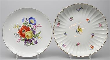 Bunt gemaltes Blumenbouquet. bzw. Streublümchenmalerei, Goldrand. Schwertermarke Meissen, 1860-1924 bzw. 20. Jh. 1. Wahl. D. 25 bzw. 27 cm.