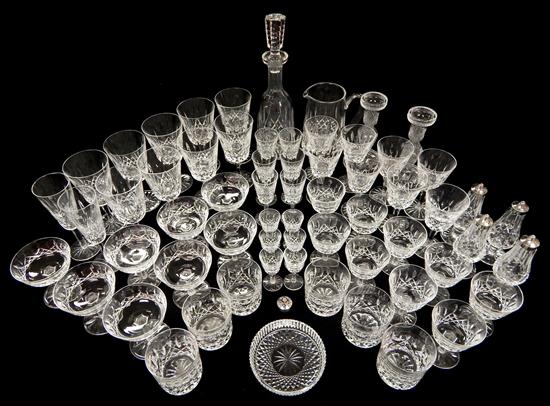"Lismore" pattern, sixty-three pieces: nine goblets, 6 7/8" h.; nine sherbet; eight claret, 5 3/4: h.; eight saucer champagne; six liqueur, 4 1/8" h.; six sherry; six old fashioned, 3 1/4" h.; four salt/pepper; two champagne flutes, one with base gro