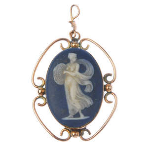 To include a pendant, the oval-shape dark blue jasperware cameo depicting a classical lady in robes, to the scrolling wirework surround, together with a ring, the circular ring depicting a putto, to the castellated mount. (23 plus a single ear clip)
