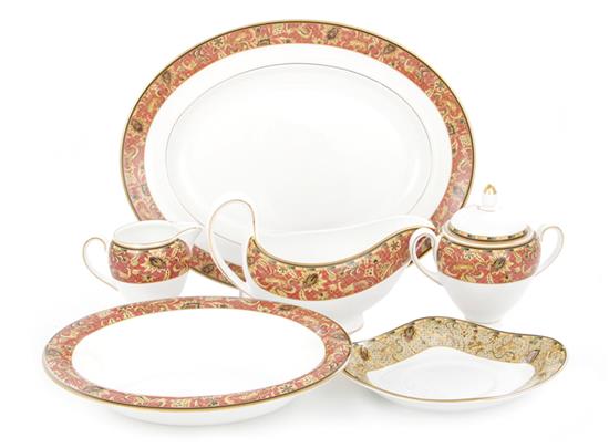 Wedgwood Persia pattern dinner service comprising: 13 plates, Dia.10 3/4" 12 plates, Dia.8" 12 plates, Dia.8" 8 soup plates, Dia.8" 13 bread & butter, Dia.6" 8 mugs, H3 1/2" 13 cups with saucers, H2 3/4" platter, L14" oval dish, L10" gravy