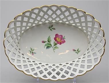 Durchbrochen gearbeitete Wandung mit Goldrand. Im Boden bunte Blumenmalerei. Unwesentliche Best. am Stand. Szeptermarke mit rotem Reichsapfel über KPM, Berlin, 20. Jh. 1. Wahl. D. 20x 27 cm.