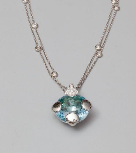 White gold necklace, 750 MM, punctuated by eight brilliant crimp wearing a blue topaz
