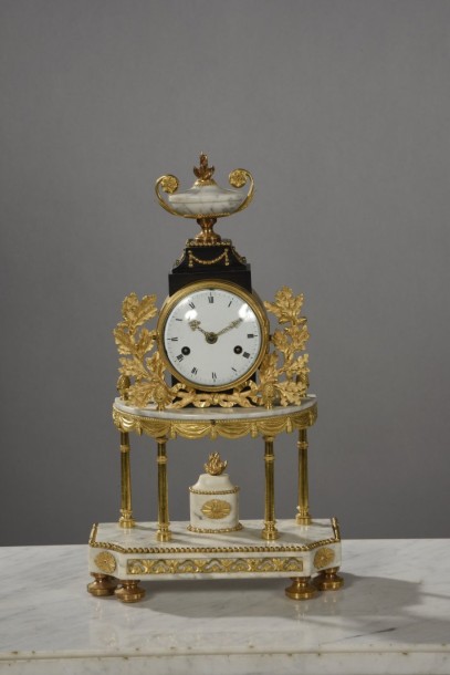Pendulum portico of white marble, black marble and gilded carved bronze. The hexagonal base is based on six feet and has a firepot in architecture with four columns. The white enamel dial is damped by an oval urn and is flanked by two arms of oak (re