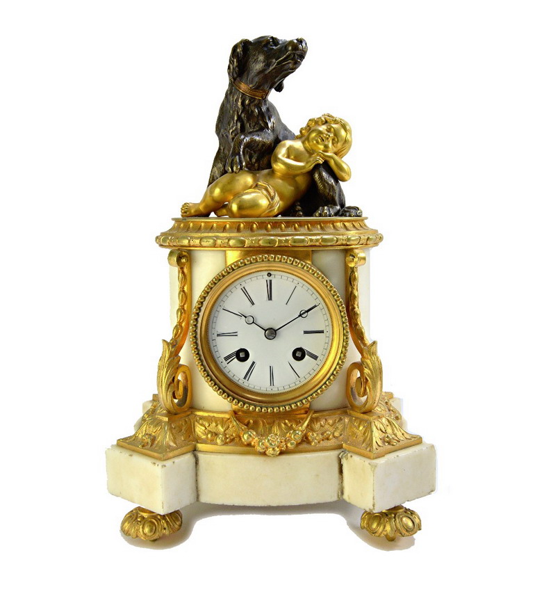with figural surmount of a dog guarding a sleeping child, the movement back plate stamped 'C.H-S PICKARD & AD PUNANT 771 PARIS' (dial replaced)