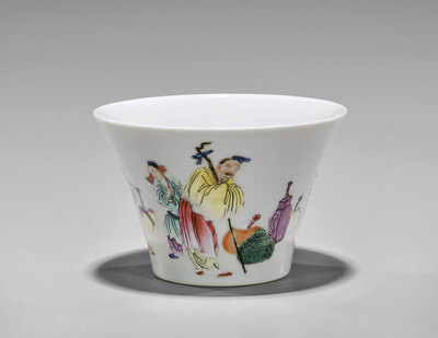 Chinese Yongzheng Mark and of the Period, eggshell-thin porcelain tea cup; of flared somewhat 'horse-hoof' form; superbly enameled with figural design of a scholar with children, and a traveling sage with attendants; Provenance: Wolch Collection, Los