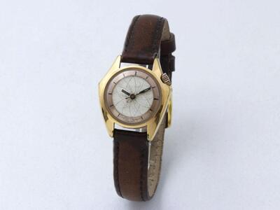 ZODIAC Montre bracelet de dame en métal doré, boîtier stylisé, cadran argenté à décor de rosace avec index bâtons peints. Couronne excentrée. Fond clipsé en acier. Mouvement automatique. Bracelet cuir avec boucle ardillon en métal doré. Diam: 24.5 mm