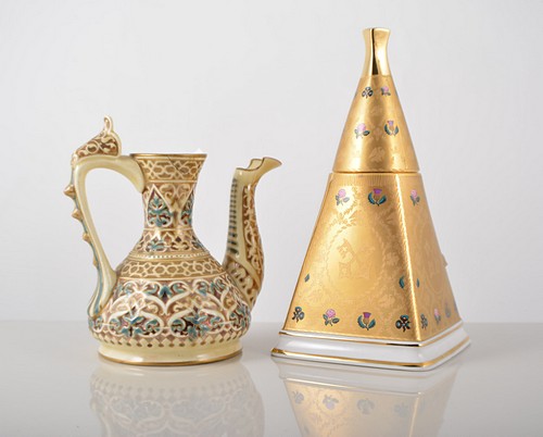 ersian design, in turquoise, tan and gilt glazed, 13.5cm together with an English porcelain, a commemorative candle holder and cover, pyramidal form