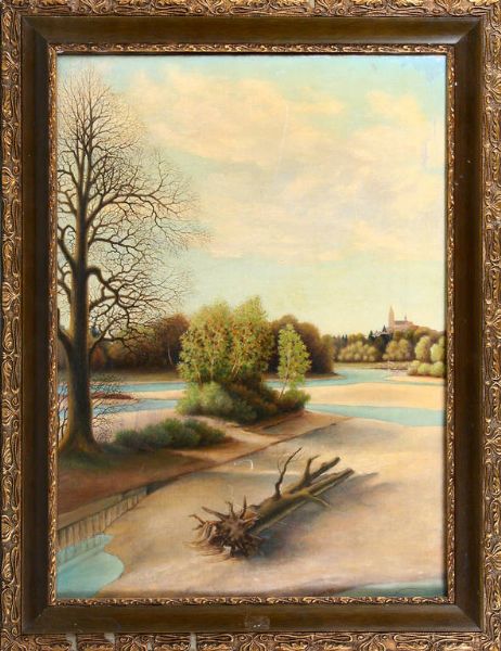 karge frühlingshafte Auenlandschaft mit Kirche im Hintergrund