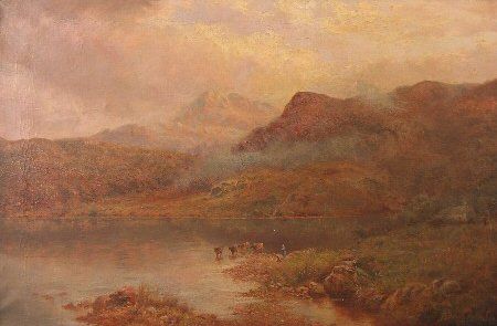 | Early Morning near Windermere, mountains in the distance with cattle watering, a figure and dog on the bank | |