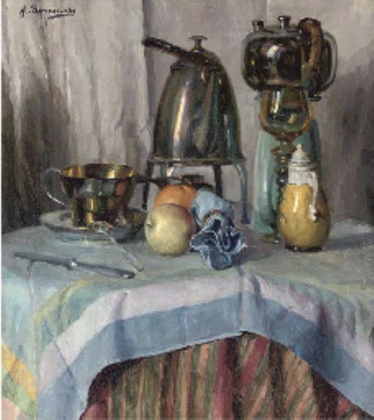 | Still life of silver, fruit, a napkin, a glass, a coffee pot and a green jug on a draped table. | |