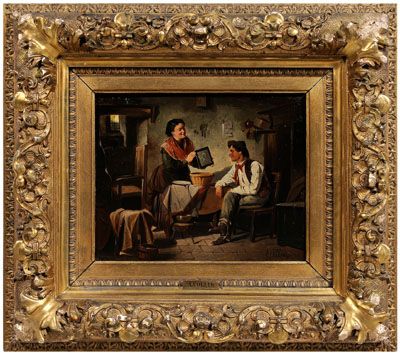 | Interior scene of woman showing a profile portrait to a gentleman seated at a kitchen table | |