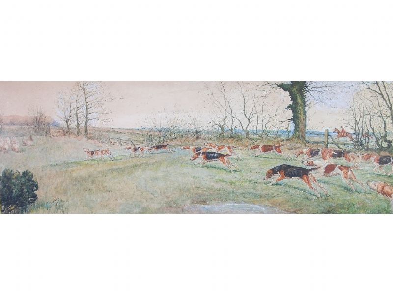Landscape with pack of hounds in full cry