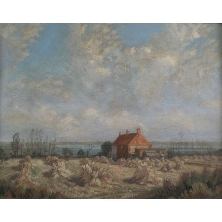 Burnham Norton, farmstead at harvest time, estuary in the background