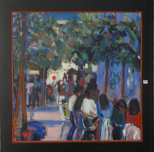 | A street scene with outdoor cafe, figures and fruiting tree canopy | |