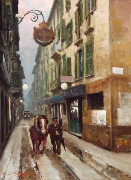 Straßenzug in Mailand, im Vordergrund ein Fuhrmann sein Pferd führend