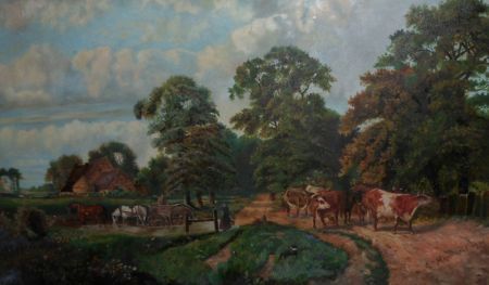 Country Landscape with Horse and Cart Crossing a Stream, Drover and Cattle in Lane
