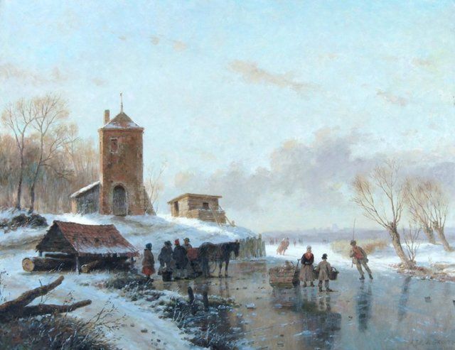 Dutch figures skating on a frozen lake next to farm buildings