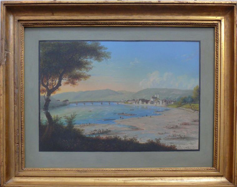 | ''Blick auf Bad Säckingen'' mit Rhein u. Brücke; am sandigen Rheinufer Angler u. Fischerboote; auf der rechten Bildseite Stadtbl | |