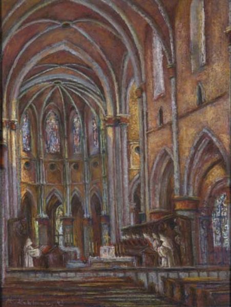 Chorraum einer Abteikirche mit Mönchen