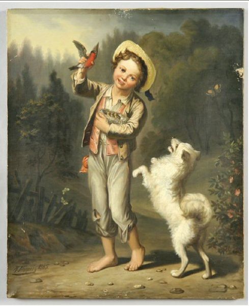 | A young boy after he has grabbed a birds nest, with the hen in one hand and the nest in the other, his dog barking at his side. | |