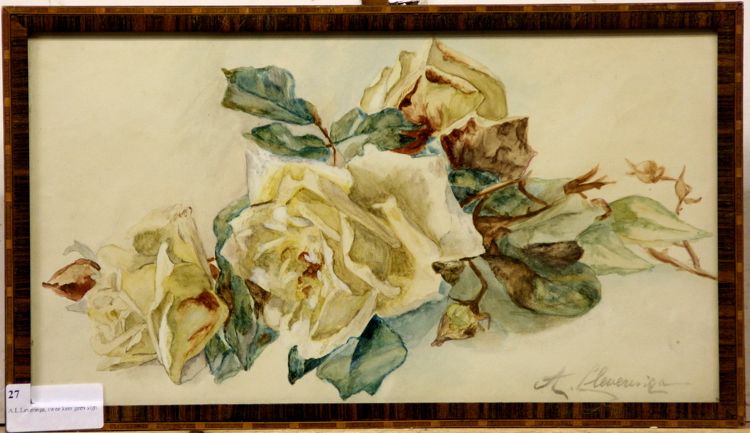 Stilleven met witte rozen, Polderlandschap met molen, en een kleurets van een Poortje