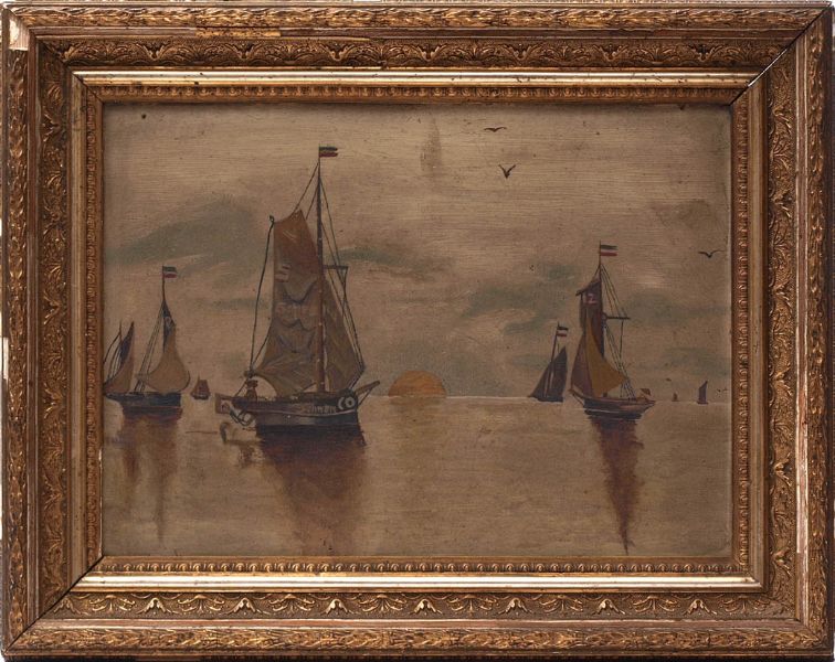 Fischerboote bei ruhiger See im Licht der aufgehenden Sonne