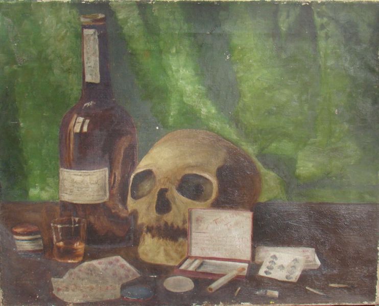 Still life with skull, scotch, and cigarettes