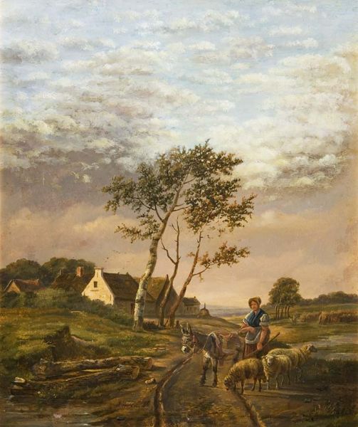 Schäferin mit Esel in Dorflandschaft