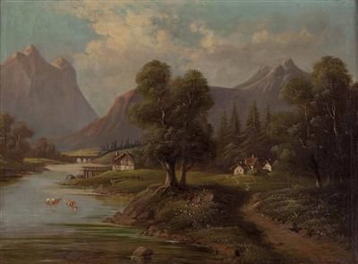 Flusstal mit Bauernhäusern im Hochgebirge