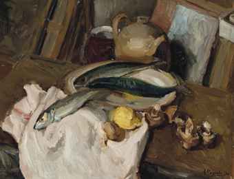 Still life of fish & vegetables on a kitchen table