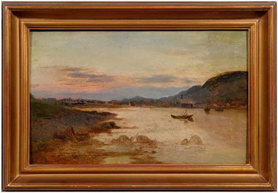sunset with figure in a boat, distant village