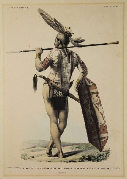 | Een Dajakker in krijgsdos, uit het hooger gedeelte der Rivier Doeson | |