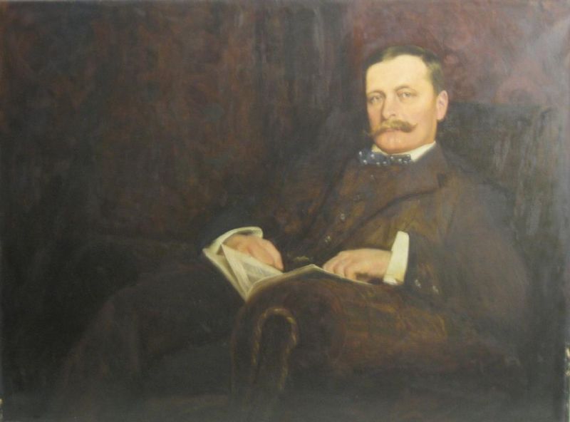 | Portrait of Mr . Davies, seated three-quarter length, at a Table, wearing a blue suit and striped bow tie | |