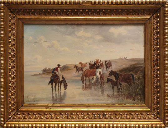 Ungarischer Hirte mit Pferdeherde an einer Furt