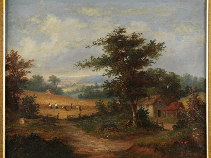 THE HARVEST, gathering hay, in a Welsh country landscape,