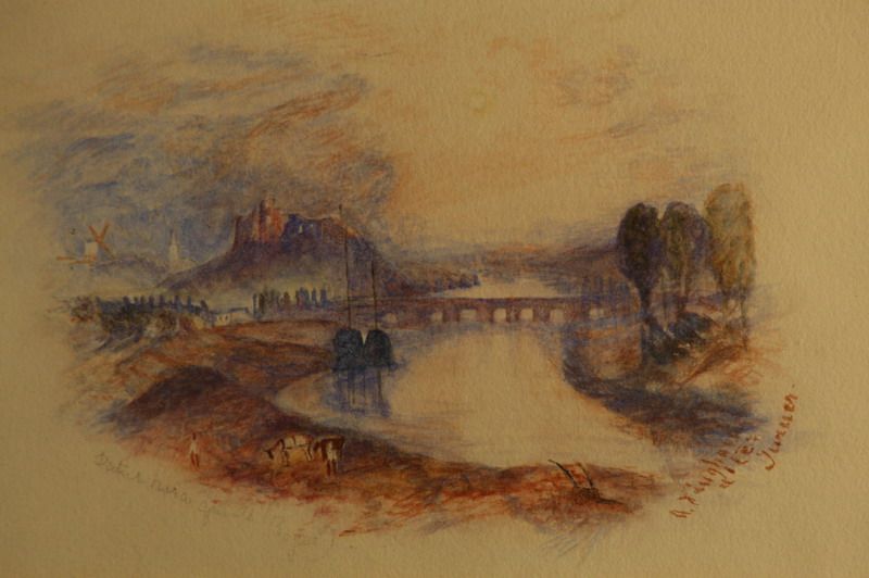 | Landscape with windmill and castle ruin in the distance and cattle by the riverside | |