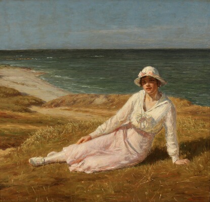 | A young woman resting in the dunes by the ocean | |